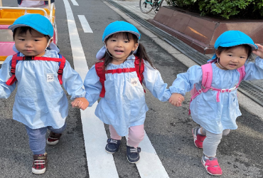 10:00になったらお散歩の時間です。まちの人たちとふれ合い、関わり合いを学びます。地域の方にあいさつして園のことを知ってもらうことでと一緒に見守ります。