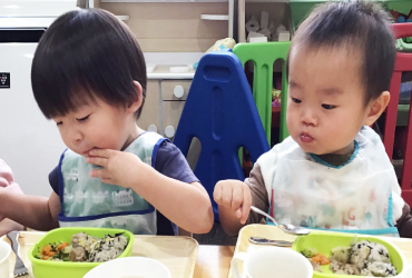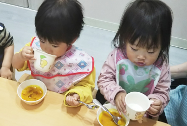 11:00になったらみんな大好きもぐもぐタイムです。園内の給食室で作ったおいしいご飯をみんなと一緒に「いただきます」。天王寺園ならてんしばで食べることも。