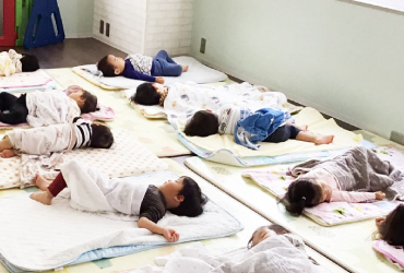 12:00、午前中あそびつかれて、おなかいっぱいの子どもたちはスヤスヤ夢の中。どんな夢をみてるのかな?寝る子は育つ!午後も楽しく遊ぼうね。